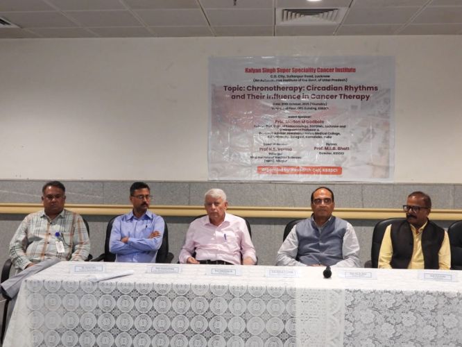 The Research Cell of Kalyan Singh Super Speciality Cancer Institute, Lucknow organized an enlightening guest lecture today on the topic “Chronotherapy: Circadian Rhythm and their Influence in Cancer Therapy.” The keynote speaker, Prof. Madan M. Godbole, Former Professor, Department of Endocrinology, SGPGIMS, Lucknow, and Research Advisor, KLE University, Karnataka, explained that the circadian rhythm functions as the body’s biological clock, influencing the effectiveness of medications. He highlighted that through chronotherapy, administering drugs at the optimal time can significantly enhance the effectiveness of cancer treatment. Prof. N. S. Verma, Principal, Hind Institute of Medical Sciences, in his address emphasized that incorporating chronobiology into cancer research and treatment can improve therapeutic outcomes for patients. The session was presided over by Prof. M.L.B. Bhatt, Director of the Institute, with Prof. Sabuhi Qureshi, Dean, as Co-chair. The event was coordinated by Prof. Sharad Singh and Dr. S. Srivastava. The program witnessed active participation from faculty members, residents, and nursing staff.